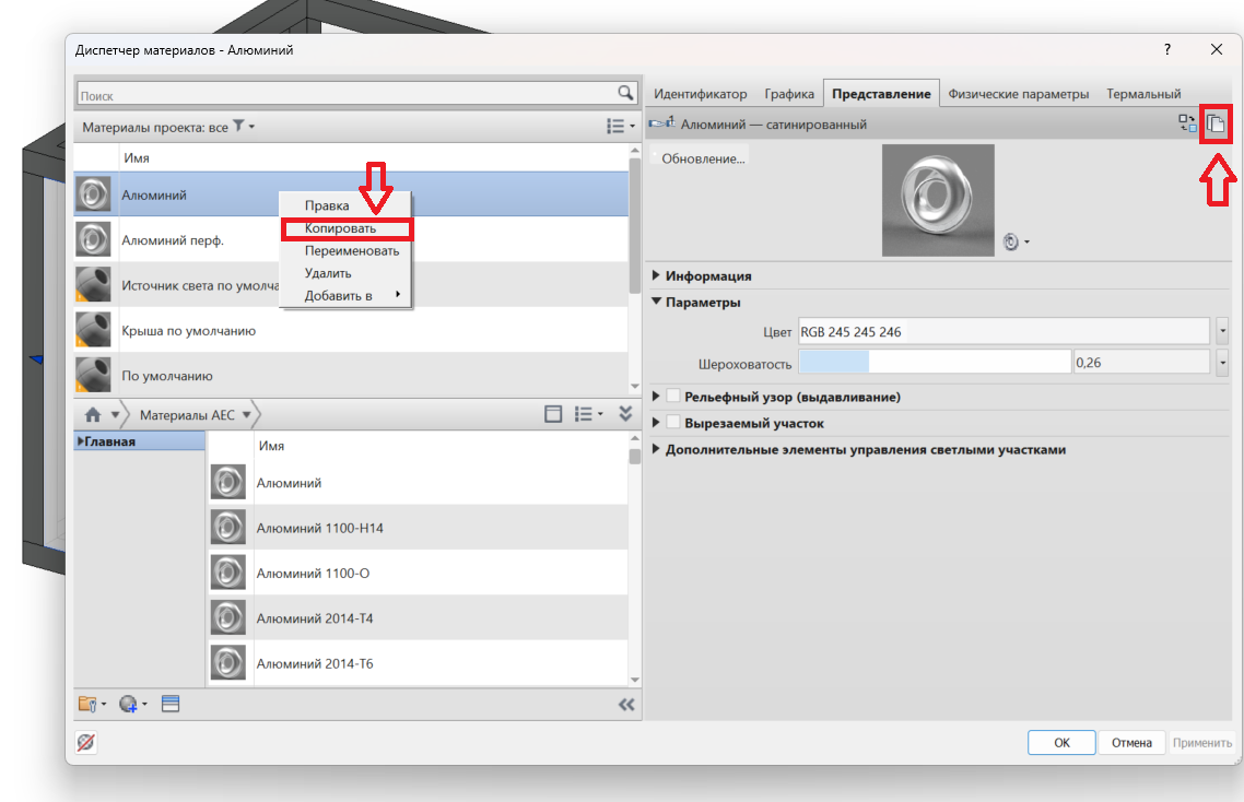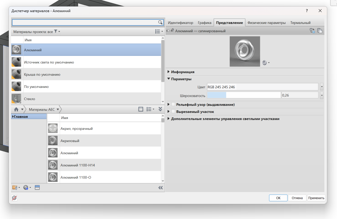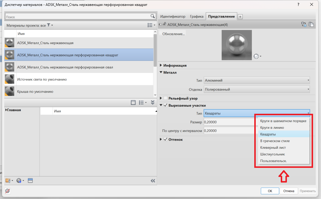 Для создания перфорированного материала, необходимо зайти в диспетчер материалов и найти необходимый материал. В качестве примера возьмём алюминий.
