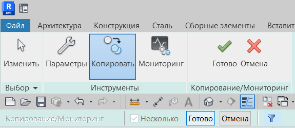 После фильтрационного выбора нажимаем “Готово” для функции “Копировать” и убеждаемся, что все ранее выбранные элементы скопировались в модель и рядом с ними появились обозначения мониторинга.