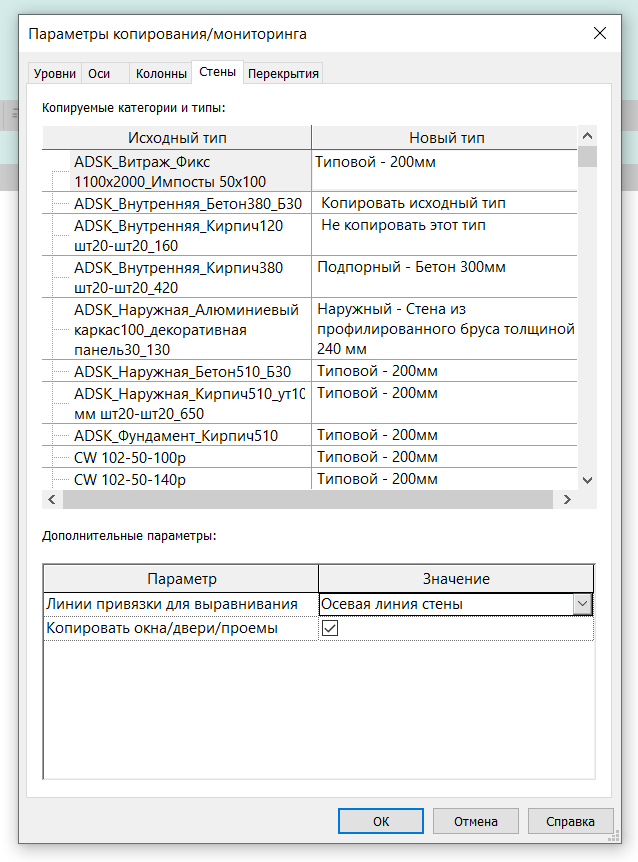 Тут существует несколько вариантов: есть возможность копировать исходный тип и конструкция будет с точно таким же типоразмером как и в файле архитектуры, либо “Не копировать этот тип” и тогда элемент не будет копироваться вовсе, либо выбрать любой другой тип при необходимости.
