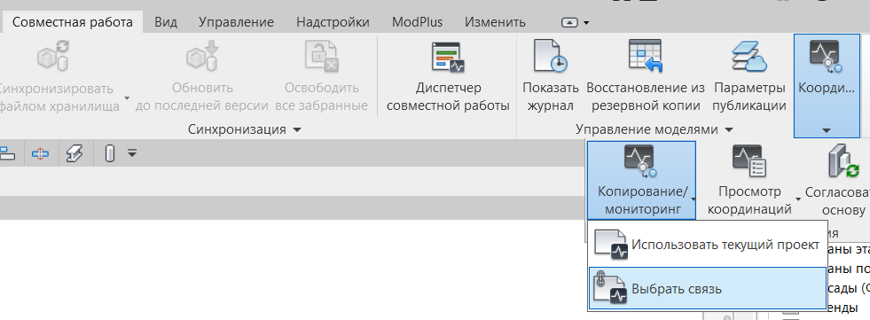 Переходим на вкладку “Совместная работа”, выбираем подраздел “Координация”, затем нажимаем на функцию “Копирование/мониторинг”, “Выбрать связь” и щелкаем уже на подгруженную связь АР.