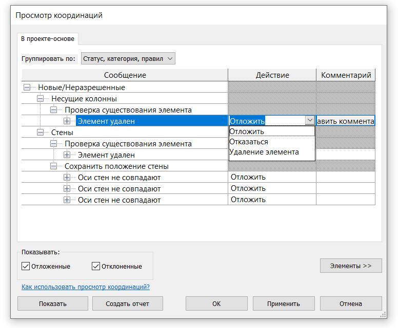 - Данные предложения система выносит исключительно по тем элементам, которые мы скопировали из связанного файла и по которым ведется мониторинг. В случае новодобавленных конструкций и тех элементов, по которым мониторинг не производится, в окне просмотра координаций они отображаться не будут.