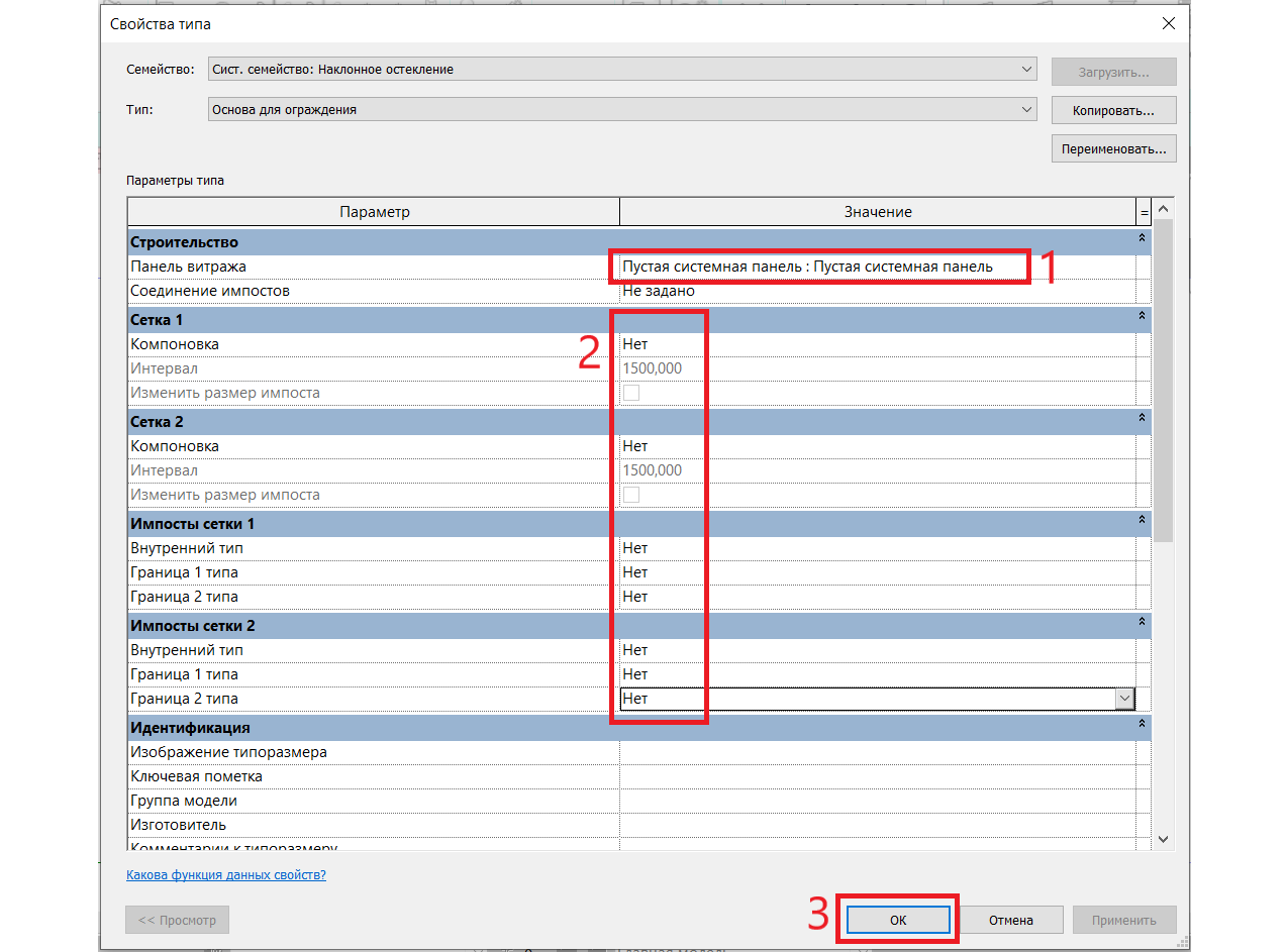 В строке «Панель витража» выбираем пустую системную панель (1), чтобы она не отображалась на видах и не вызывала коллизий. Настраиваем сетки витража и импосты (2) соответственно скриншоту: