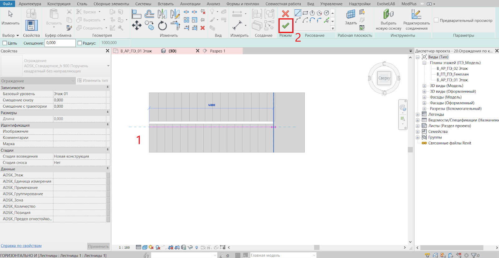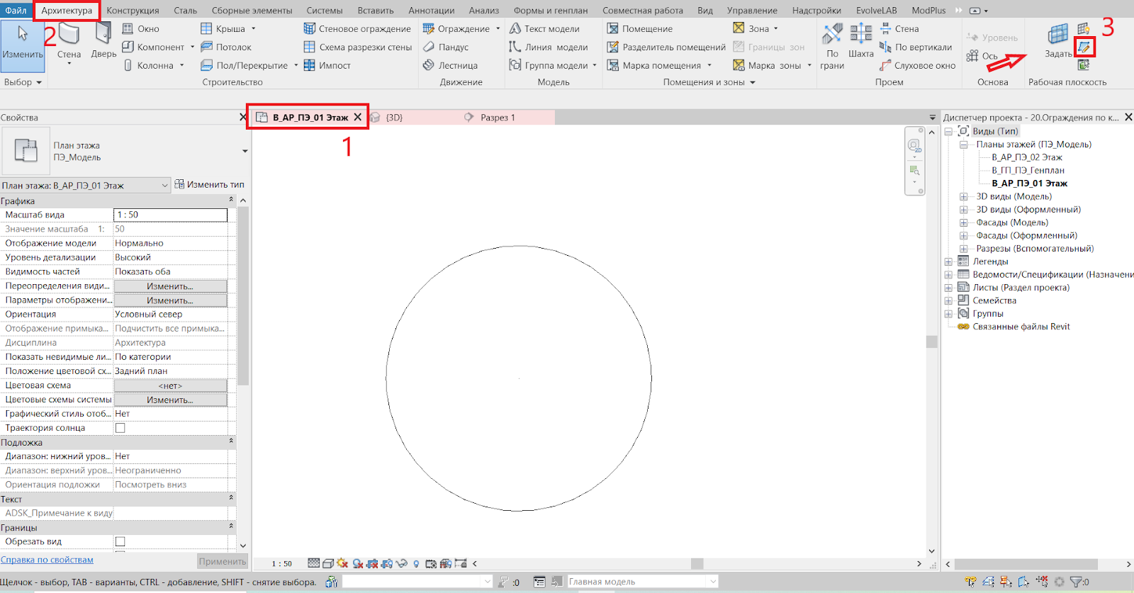 7. Отрисуем ограждение. Находимся на том же виде -> вкладка «Архитектура» -> «Ограждение»:
