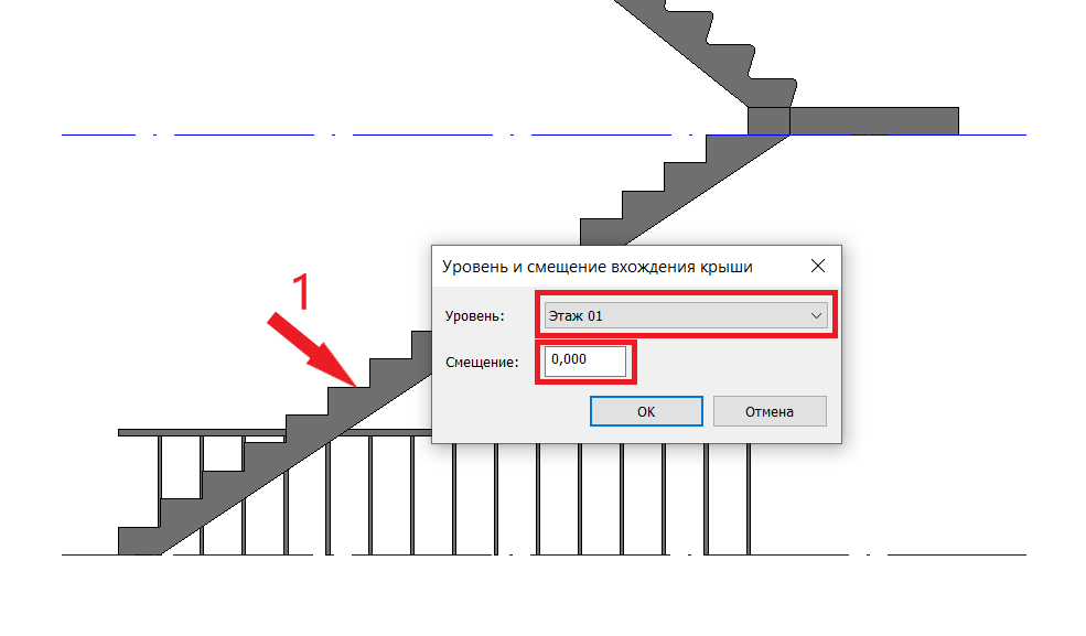 Наводимся на торец марша и кликаем по нему, появляется окно с выбором уровня и смещения. В нашем случае оставляем Этаж 01 и смещение 0,000.