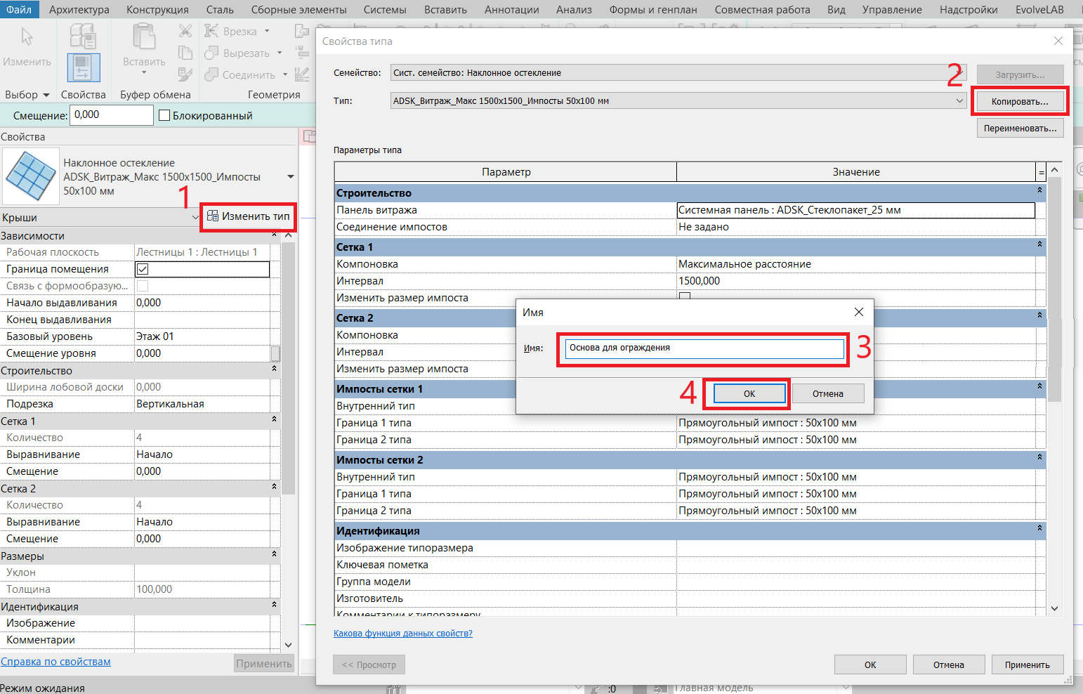Кликаем «Изменить тип» -> «Копировать» -> задаем имя «Основа для ограждения» -> «ОК» -> продолжаем настраивать ->