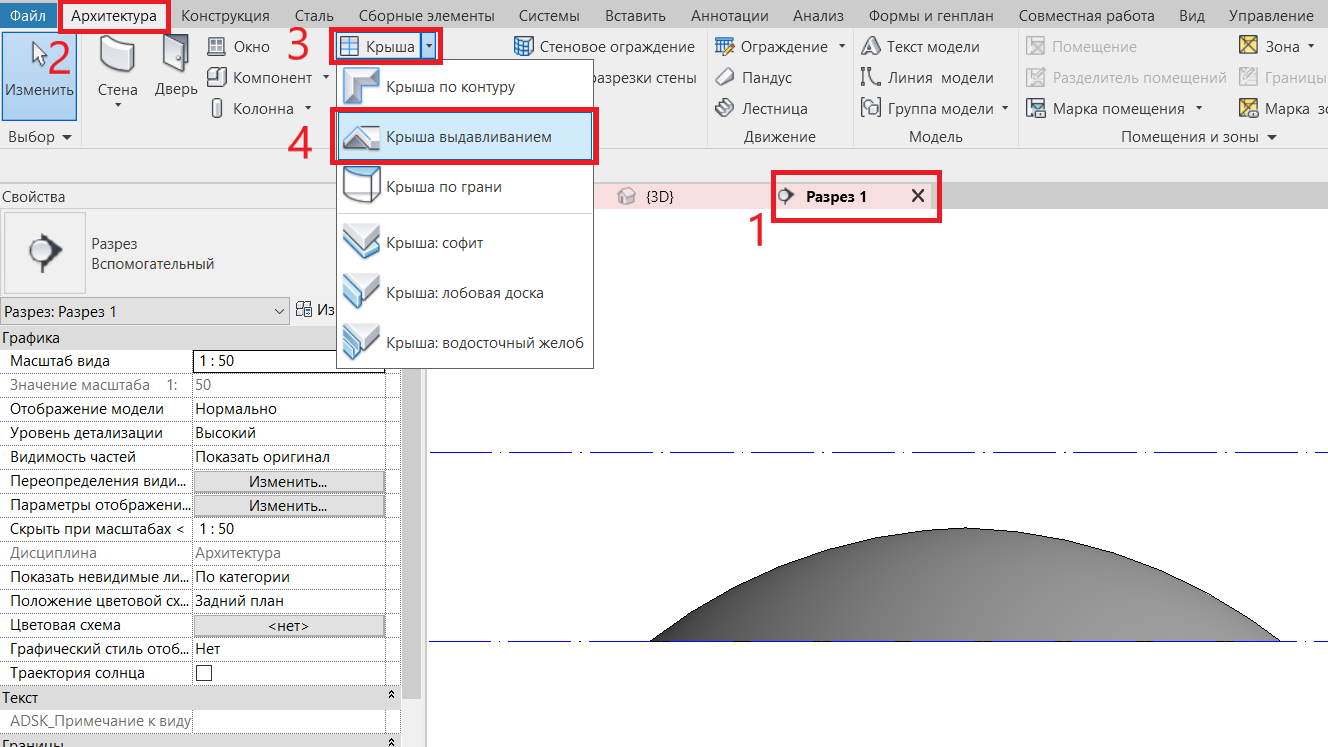 - Построение будем производить на разрезе. Переходим во вкладку «Архитектура» -> «Крыша» -> «Крыша выдавливанием» ->