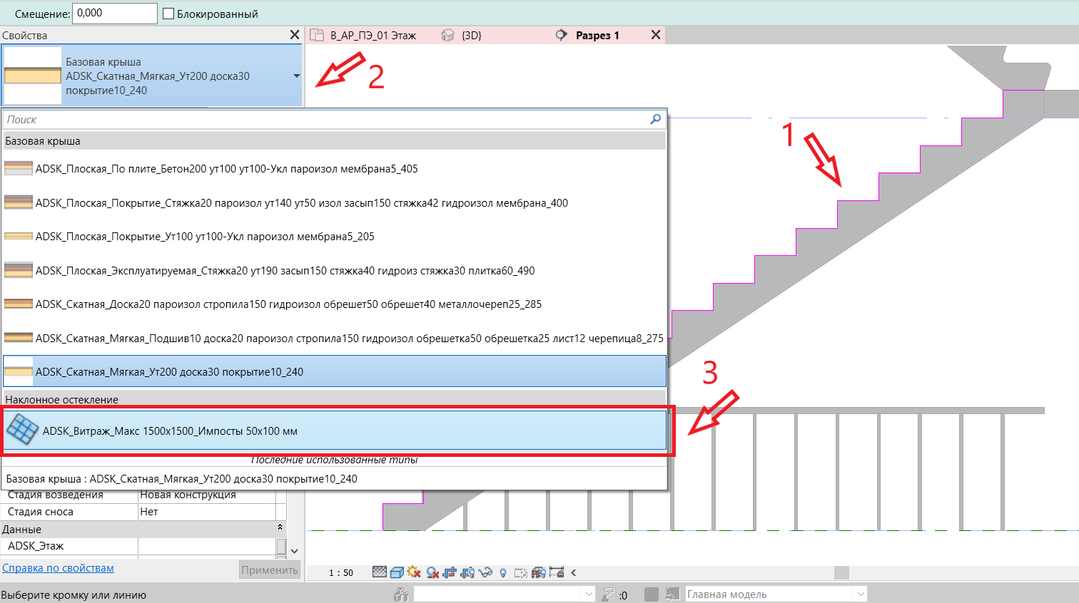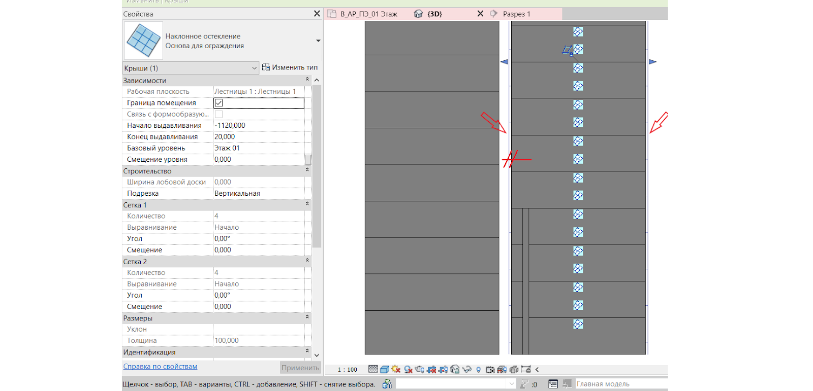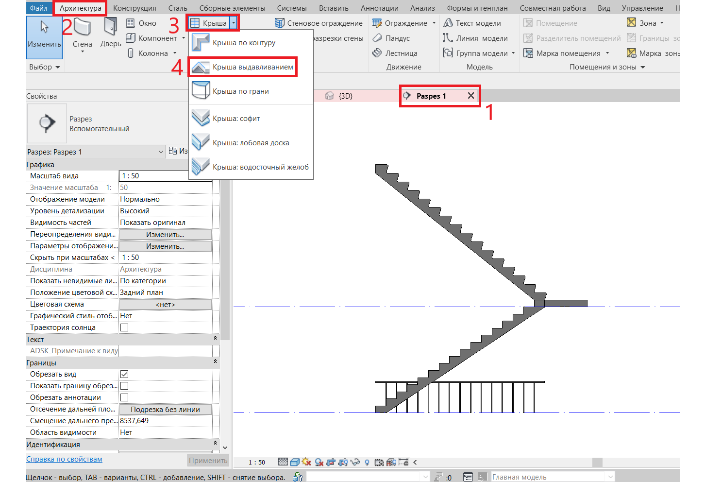 2. Разместим основу для ограждения – крышу, как делали для лестничных маршей. Находимся на разрезе -> вкладка «Архитектура» -> «Крыша» -> «Крыша выдавливанием» ->