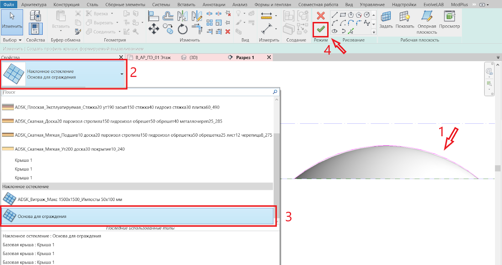5. Строим эскиз профиля, дугу, вручную -> выбираем ранее созданный тип крыши «Основа для ограждения» -> кликаем зеленую галочку.