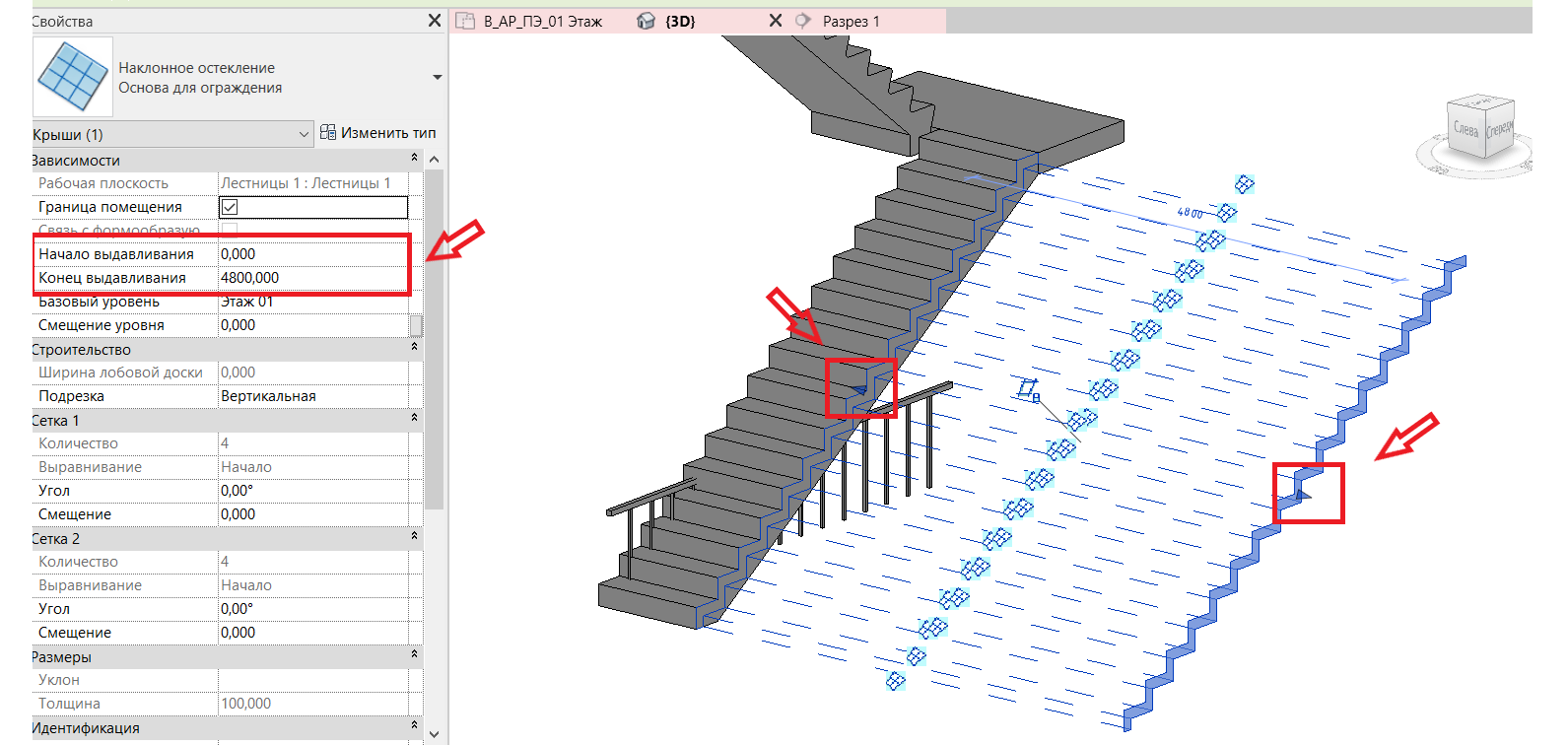 6. Отредактируем границы выдавливания. Переходим на план этажа (уровень) -> подтягиваем границы за «ручки» так, чтобы они немного отступали от опорной плоскости с двух сторон: