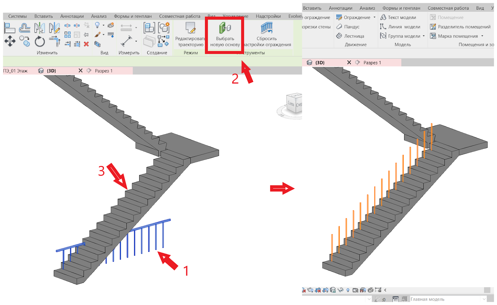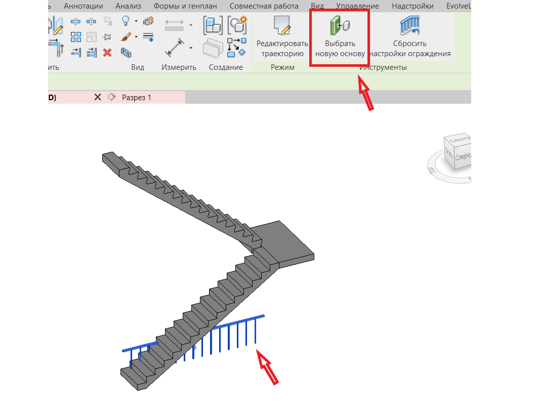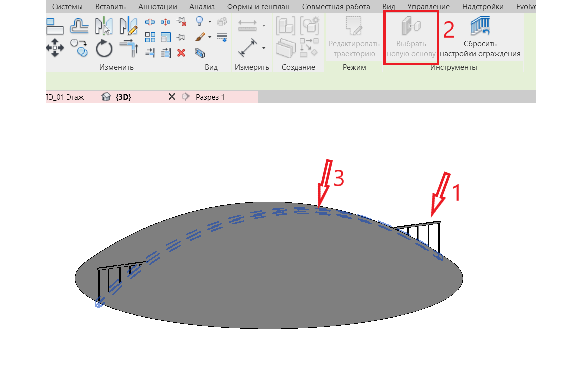 6. Выберем основу для ограждения. Кликаем по ограждению -> «Выбрать новую основу» -> кликаем по созданной «невидимой» основе. В результате видим, что стойки ограждения заняли верное положение, но с перилами произошла ошибка.
