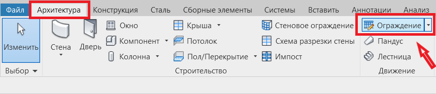 Переходим во вкладку «Архитектура» -> «Ограждение» ->